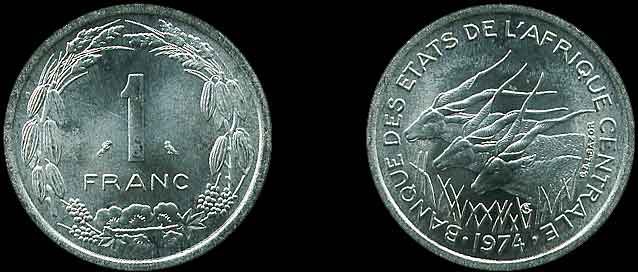 KM# 8 1 Franc 1974 Left: Value Right: Three giant eland and date Composition: Aluminum Diameter: 23.0 mm