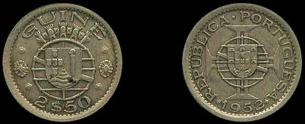 KM# 9 2 ½ Escudos 1952 Left: Value Right: Date Composition: Copper-Nickel Diameter: 20.4 mm (Portuguese Guinea)